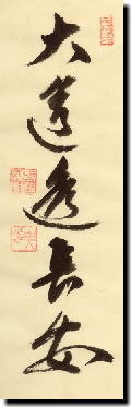 つまり、仏法とか真理などと云うものは遥か遠くにあるわけでもなく、何か特別難しいものでもなく、極々普段の生活の中にあり、身近なところにあるのだという教えとして、垣根のすぐ前の小さな道こそ、長安に通じるように仏の世界、悟りの世界へ通じる大道なんだよと示した言葉が「大道透長安」なのである。老師様方の説法でよく例えとして“わけのぼるふもとの道は多けれど々高嶺の月を見るかな”と云う一休さんだかの歌をもって示される。